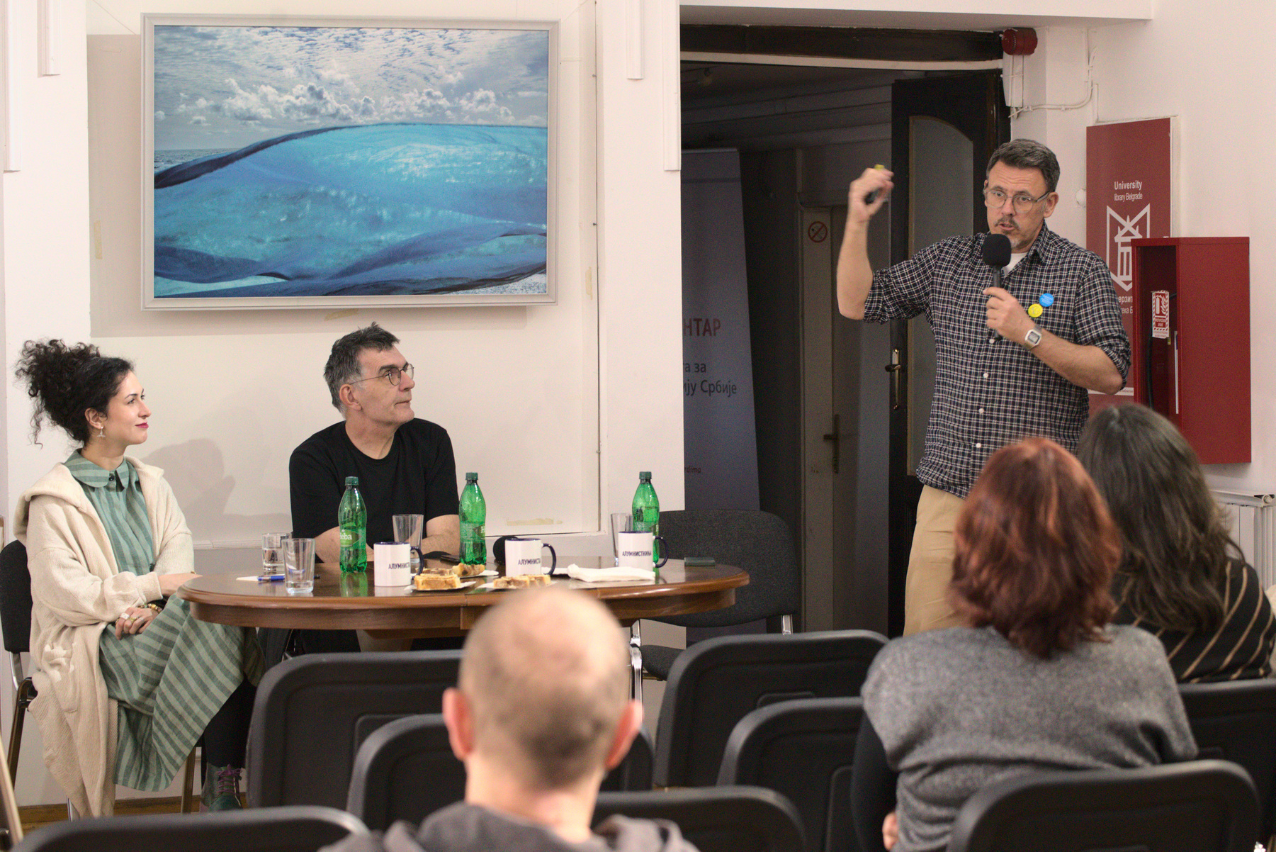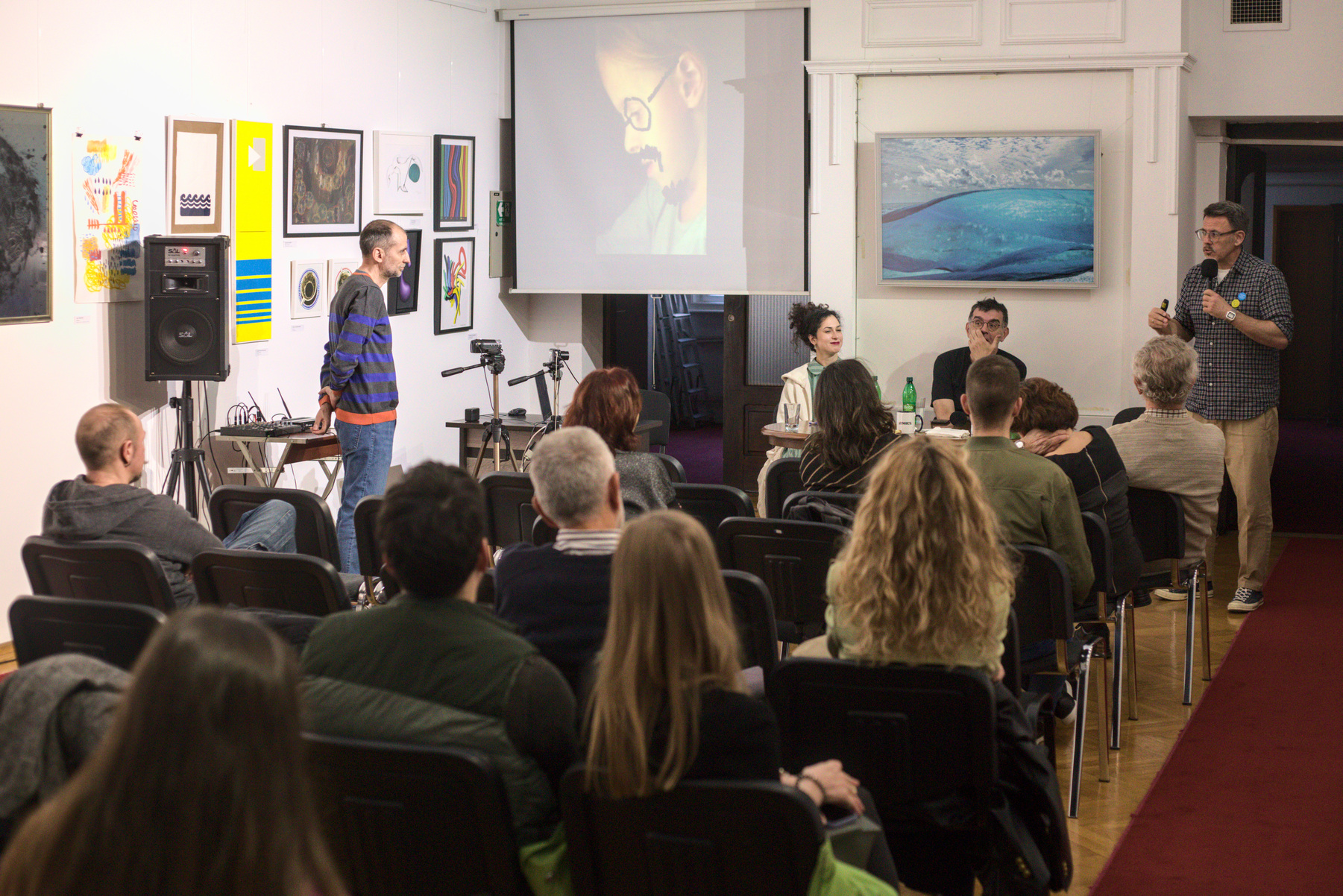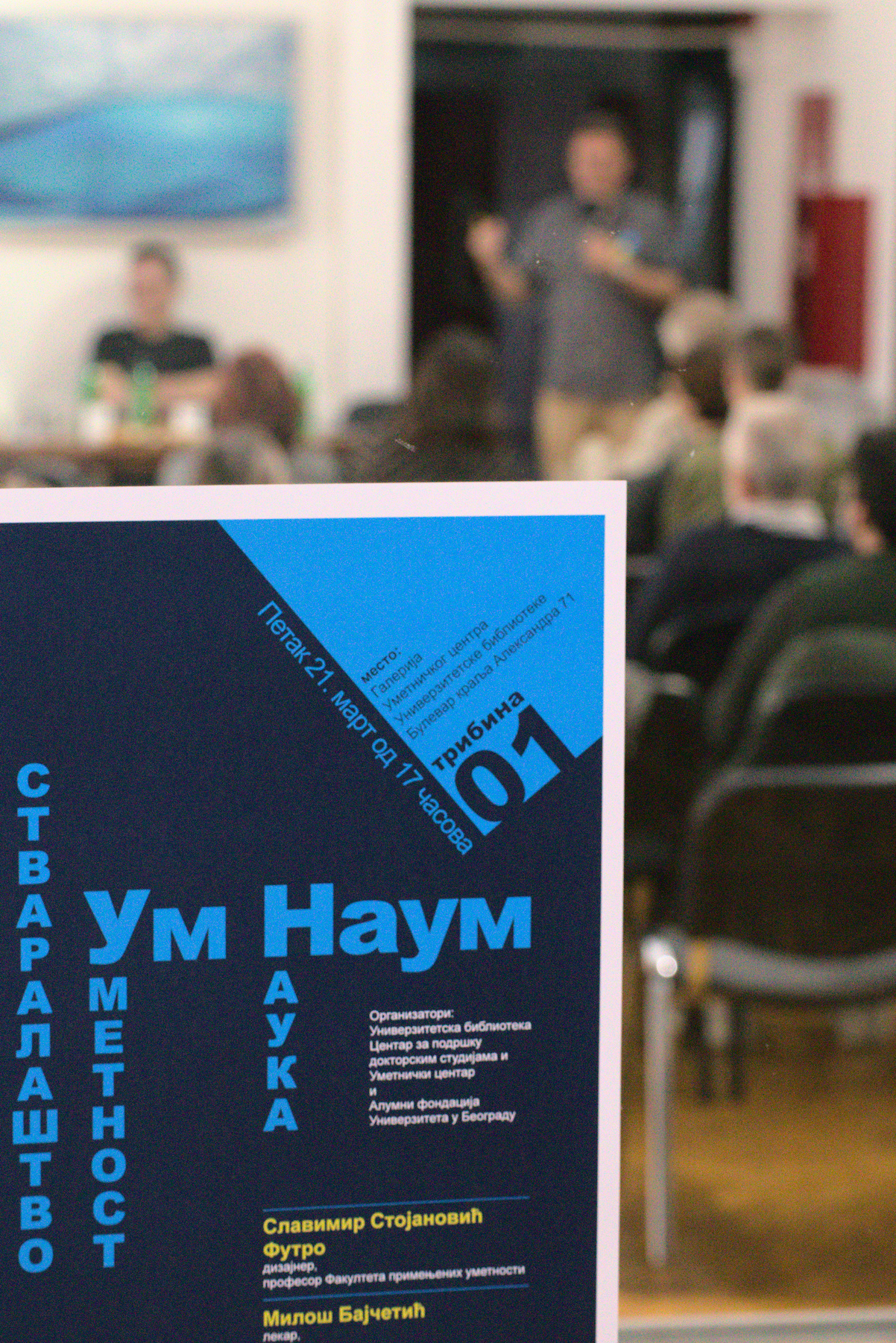 На трибини, првој у оквиру серије „Ум Наум“, страну уметности заступао је Славимир Стојановић Футро, дизајнер обележен као знаменито име у области графике и дизајна у образложењима жирија више стотина награда, домаћих и светских. Како сам каже – награду за животно дело добио је пре него што је дипломирао. Његова надахнута презентација водила нас искреношћу, духовитошћу и без патетике кроз изазове у животу које су га навеле да својим талентом осликава и стварност и оно иза ње као и испред. Стваралаштво као самоостварење.